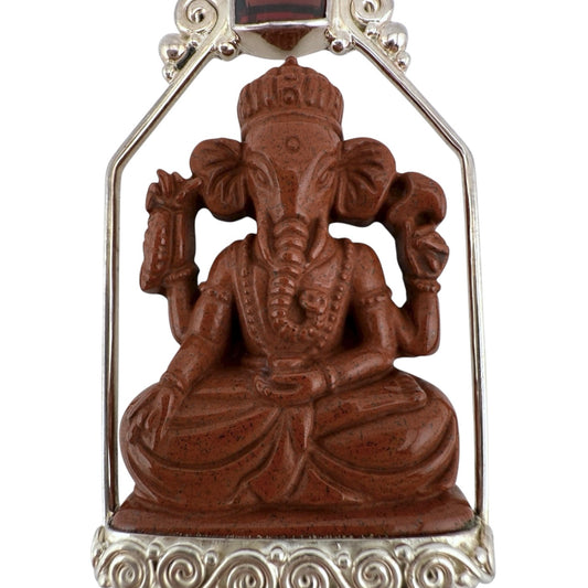 Intricately Carved Red Jasper Ganesha Pendant by Sajen, Accented with Faceted Garnets & 925 Sterling Silver