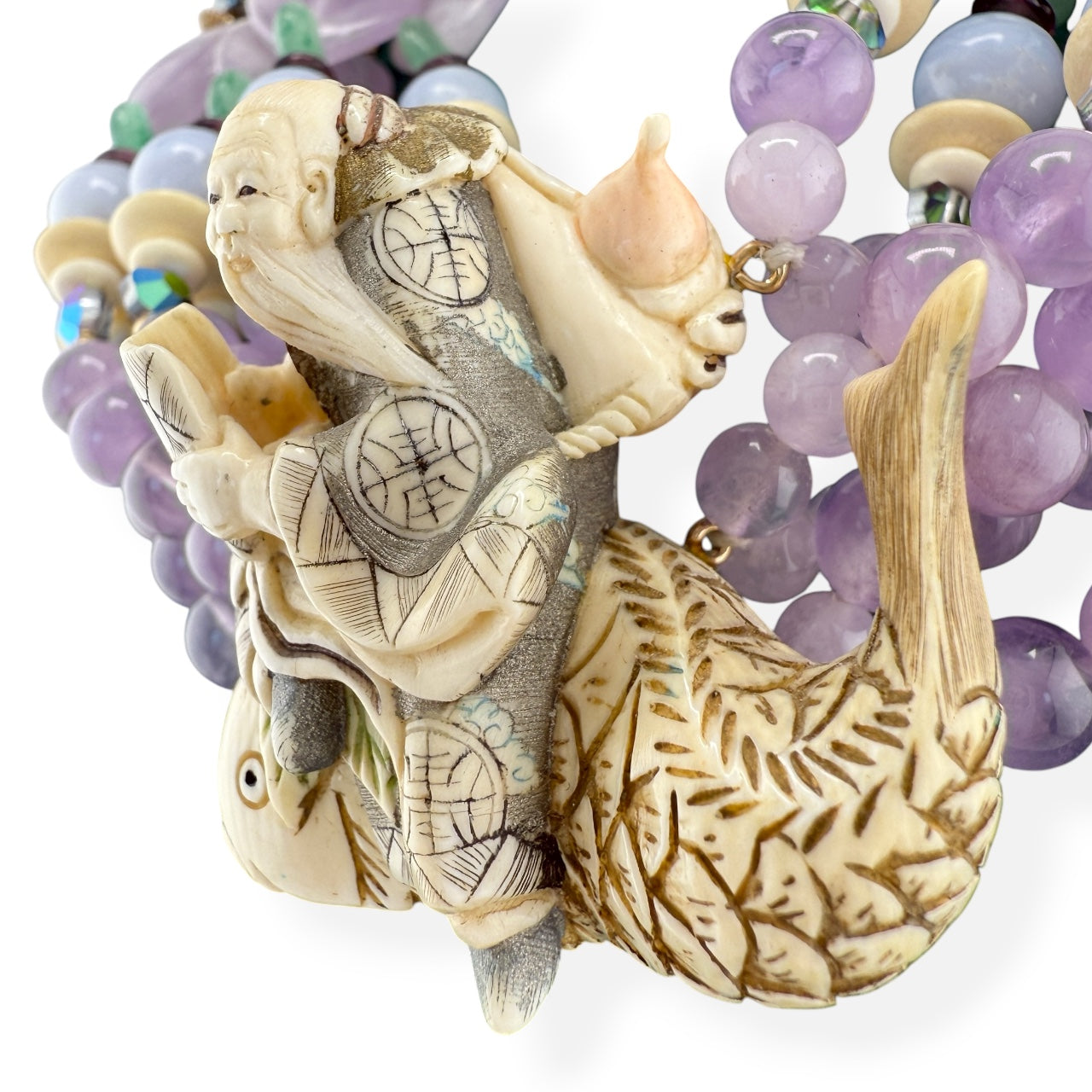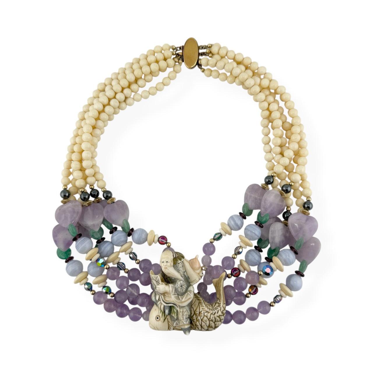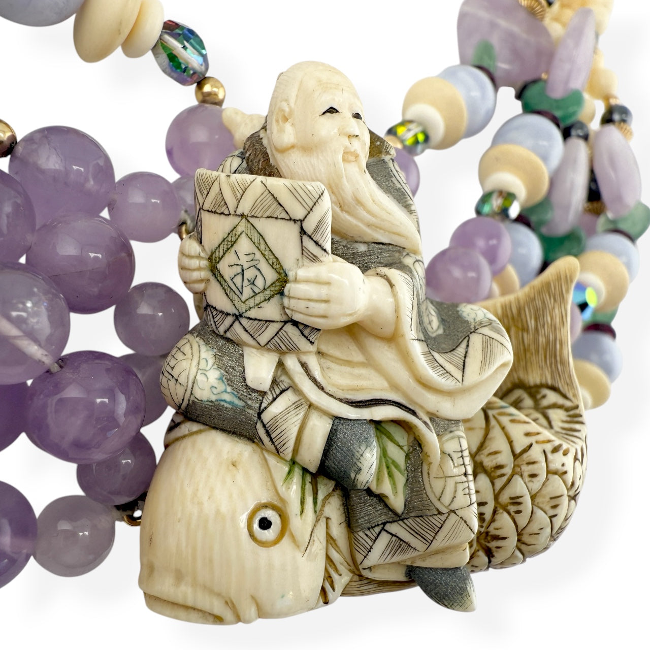 This magnificent, multi-strand statement necklace showcases the intricate artistry of early to mid-20th century Japan. The centerpiece is a finely detailed ivory carving depicting the mythical sage Kinko Sennin riding a Carp, bearing the artisan's red square seal mark. This rare focal piece is suspended on an elaborate 12-strand necklace featuring a sophisticated mix of genuine gemstones, vintage elements, and ivory beads.