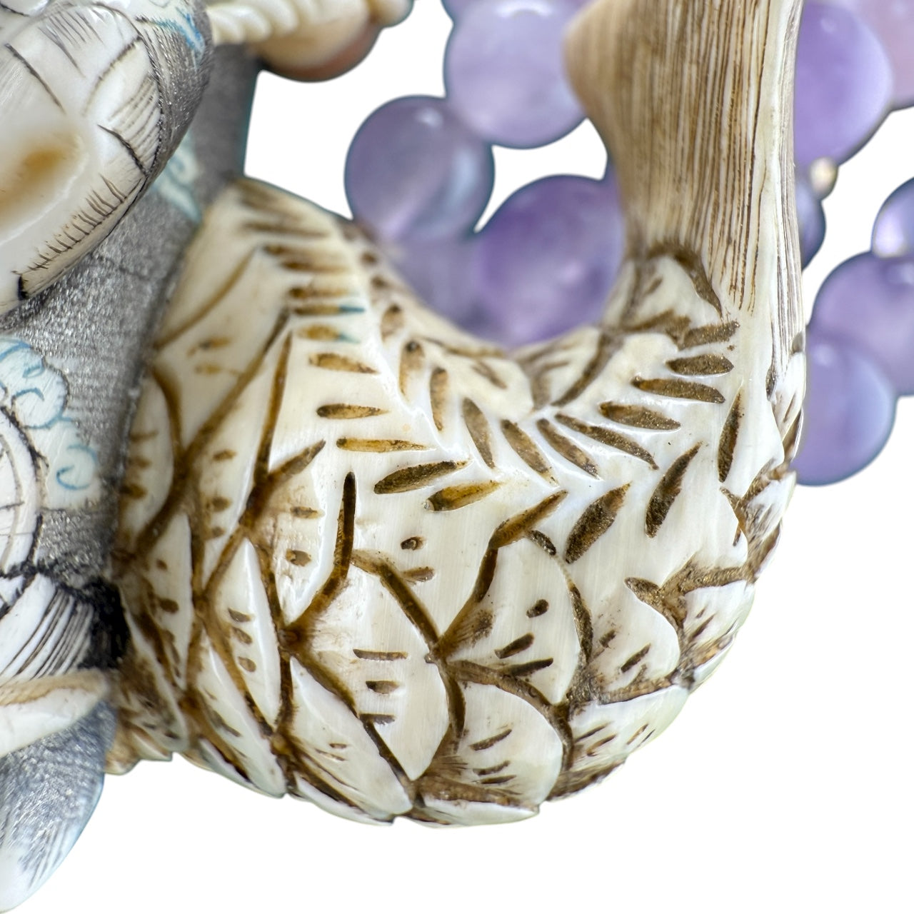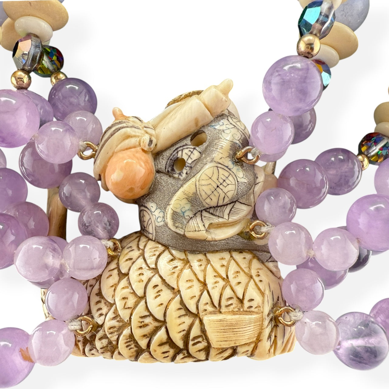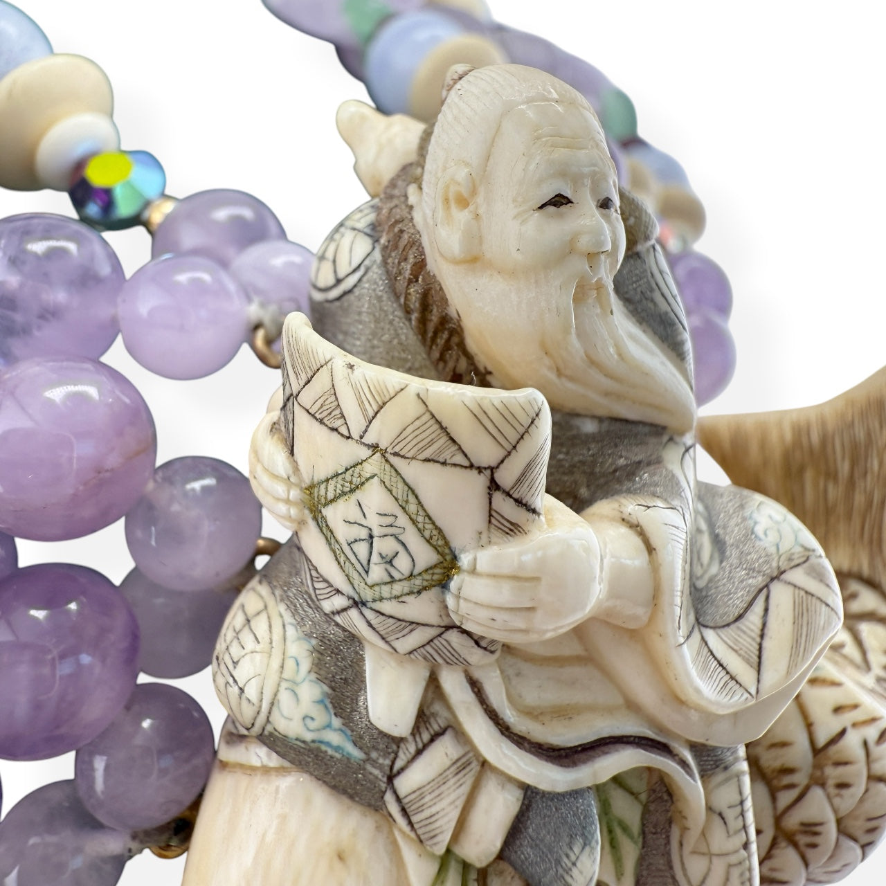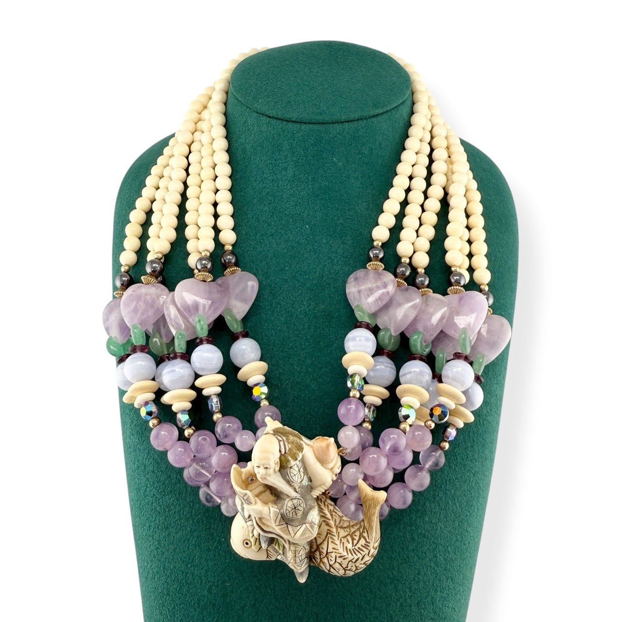 This magnificent, multi-strand statement necklace showcases the intricate artistry of early to mid-20th century Japan. The centerpiece is a finely detailed ivory carving depicting the mythical sage Kinko Sennin riding a Carp, bearing the artisan's red square seal mark. This rare focal piece is suspended on an elaborate 12-strand necklace featuring a sophisticated mix of genuine gemstones, vintage elements, and ivory beads.