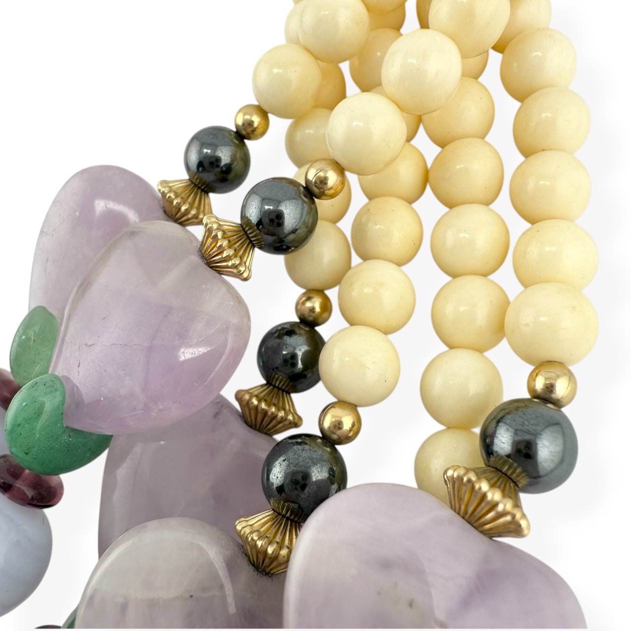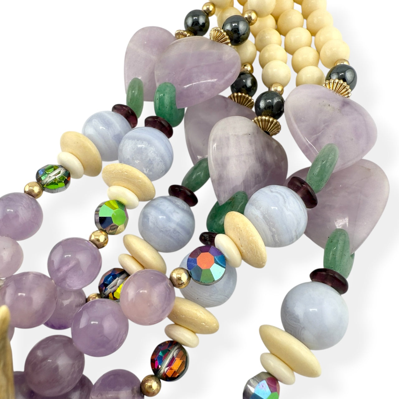 Materials: 14k Gold Filled, Ivory, Amethyst, Emerald, Blue Lace Agate, Rhinestone, Hematite