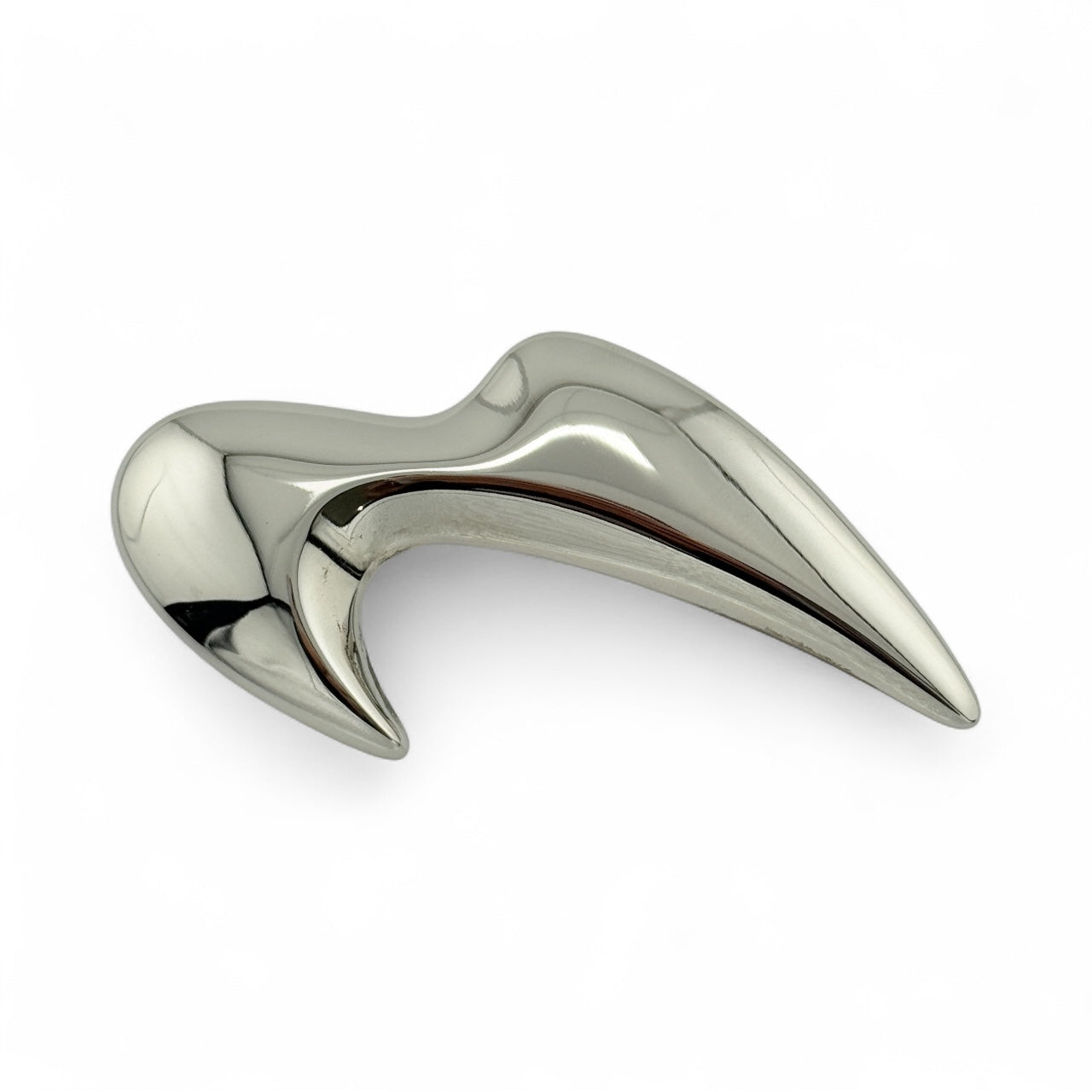 This large sterling silver brooch features an elegant modernist wave design with a polished finish, creating a bold yet refined statement. Its versatile shape allows it to be worn horizontally or vertically, offering adaptable styling options for any outfit.