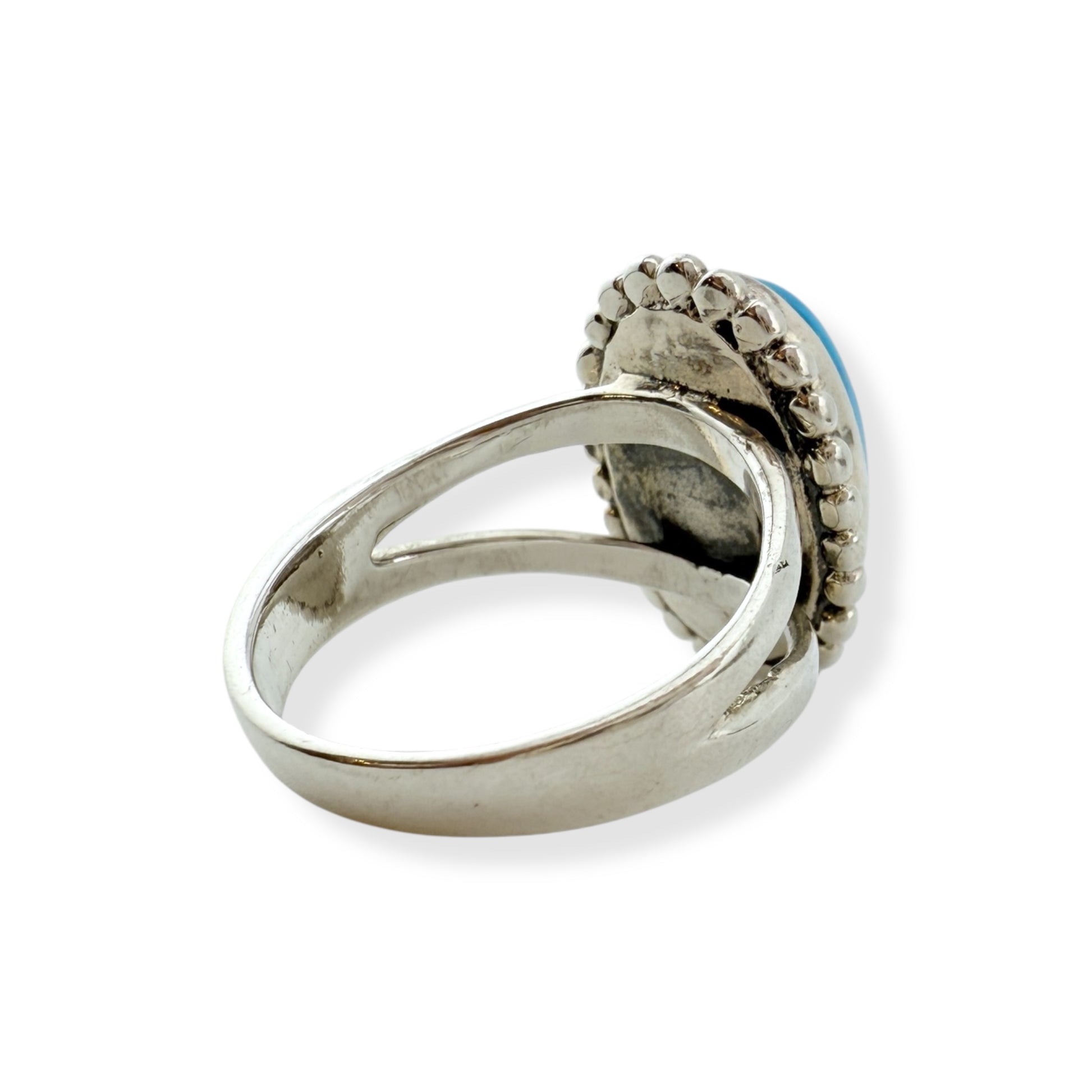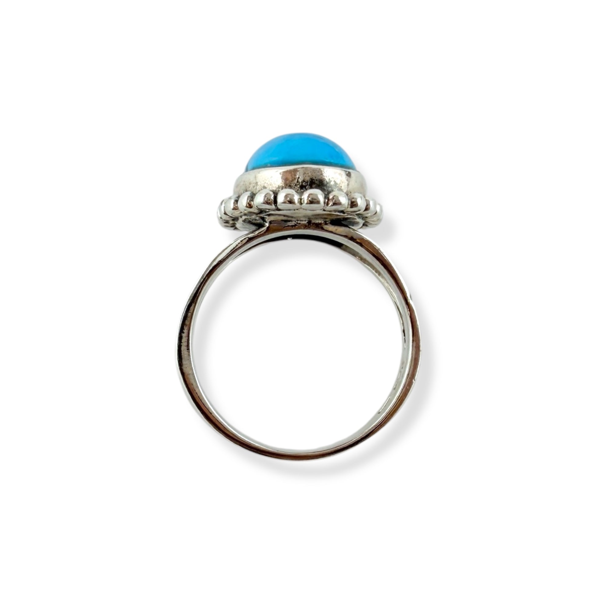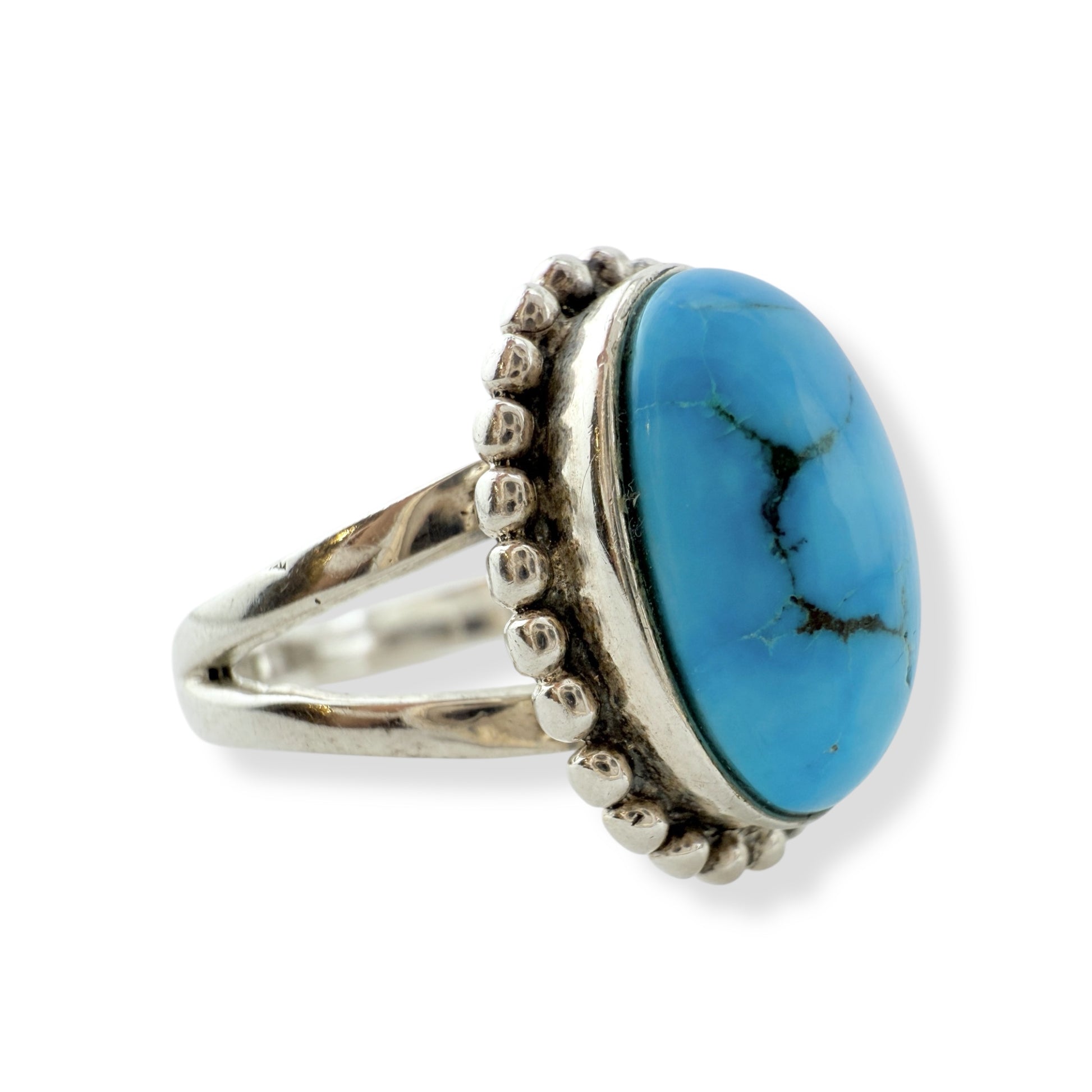 Embrace the vibrant blue beauty of this sterling silver ring, showcasing a captivating oval cabochon turquoise, which is likely Kingman Turquoise. The stone is bezel-set and elegantly accented with a classic ball beaded border. Designed for comfort with a split shank, this ring is a size 7.25.