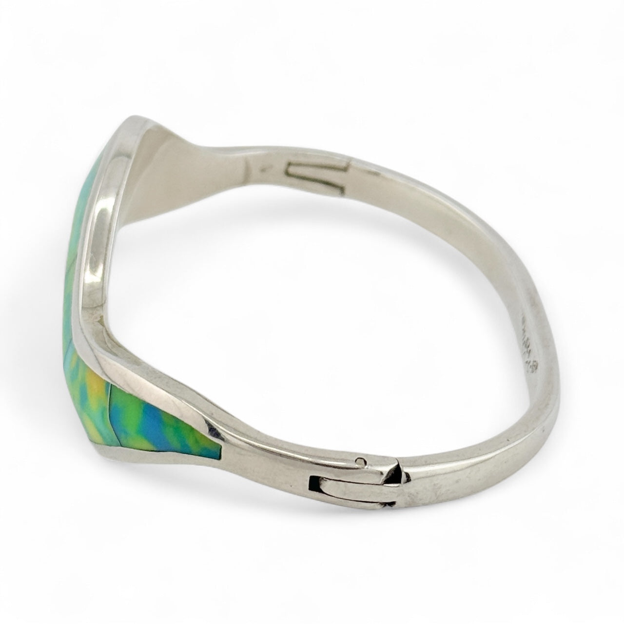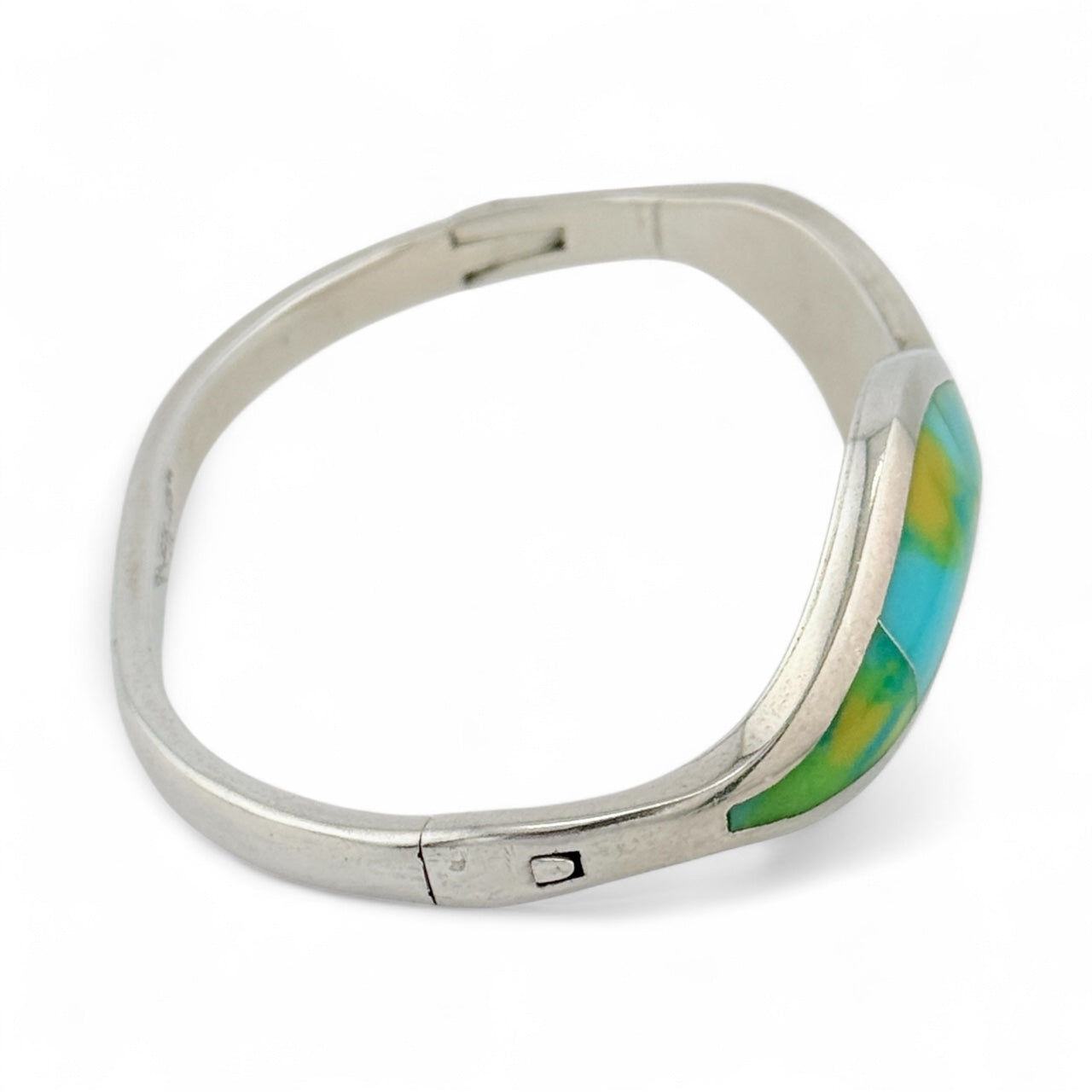 This vintage Taxco, Mexico bracelet showcases expert craftsmanship with its 925 sterling silver base and vibrant turquoise and yellow-green inlay. Weighing 35.4 grams, it features a 2.75-inch interior diameter at its widest point and a secure hinge opening. Its distinctive color combination and authentic Mexican silver hallmark make it a remarkable piece for collectors and enthusiasts of fine vintage jewelry.