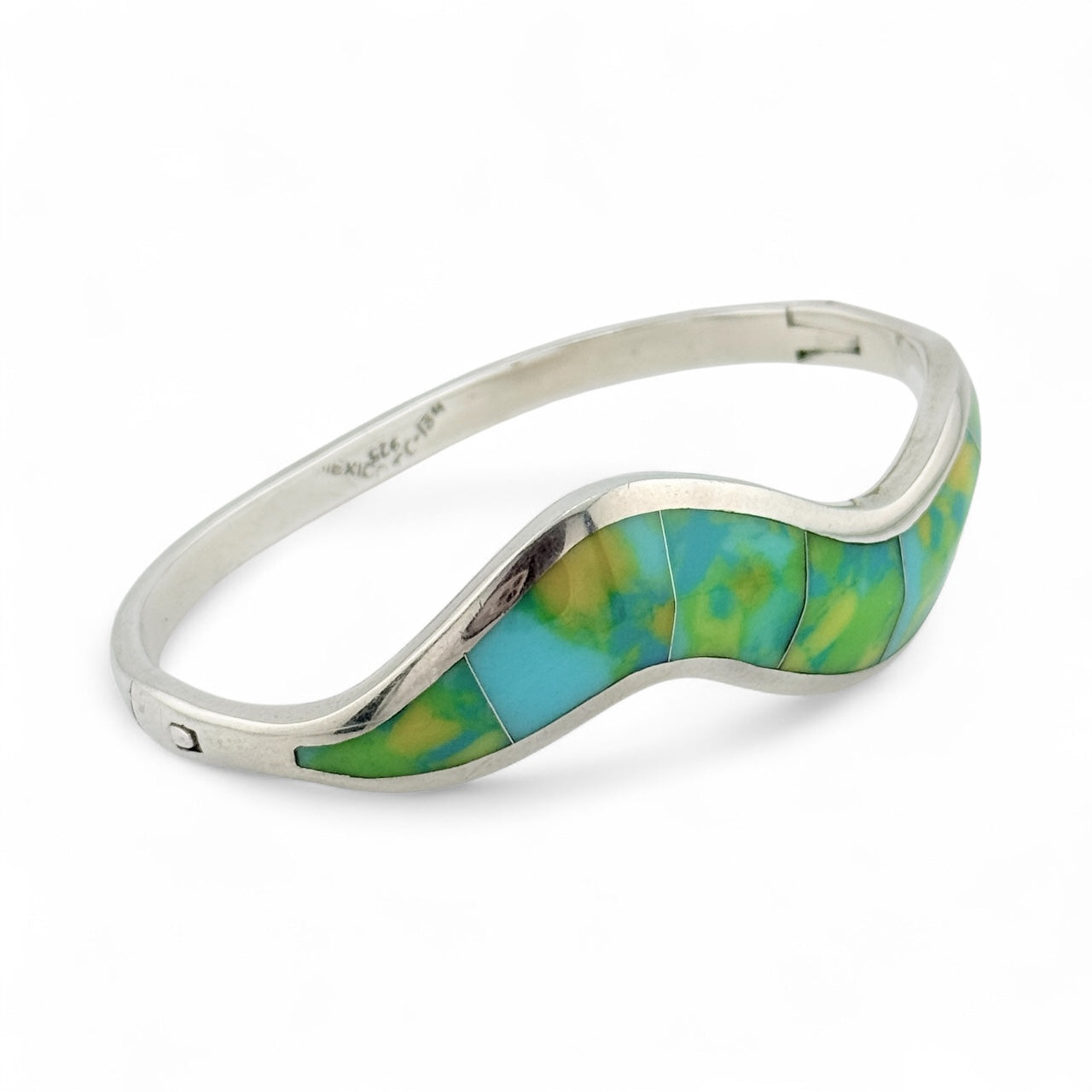 Vintage Taxco Mexico 925 Sterling Silver Wavy Turquoise & Yellow-Green Inlay Bracelet